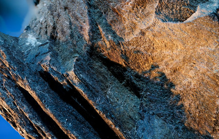 Vividly colored minerals emerge from the surface of a weathered piece of wood showing striking blue and gold hues in natural textures.