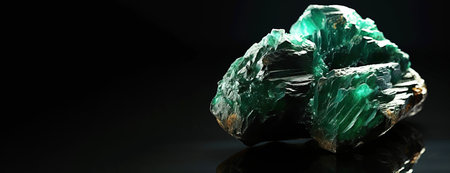 Antlerite is a rare precious natural geological stone eremite on a black background in low key. Fashionable jewelry elegant decoration. AI generated. Header banner mockup with space.