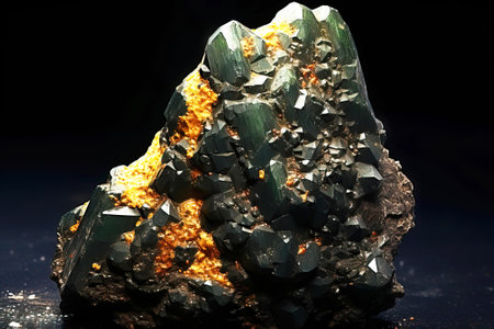 Fornacite is rare precious natural geological stone eremite on black background in low key. Fashionable jewelry elegant decoration. AI generated. Header banner mockup with space.