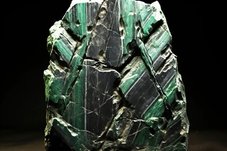 A creative digital illustration depicting Professional creative design of onyx gemstone polished surface, crystalline dark texture, focused beam lighting revealing depths, mysterious luxury aura, deep black with subtle green veins, commercial. This AI-generated artwork features unique visual elements suitable for various commercial and editorial applications. AI-generated illustration.