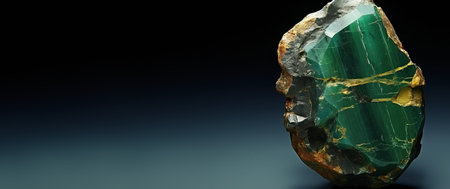 Atacamite is a rare precious natural geological stone eremite on a black background in low key. Fashionable jewelry elegant decoration. AI generated. Header banner mockup with space.