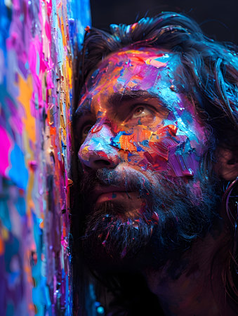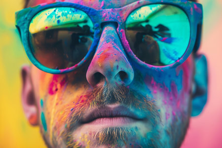 Closeup of a mans face covered in vibrant paint splashes, wearing cool sunglasses