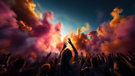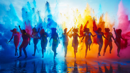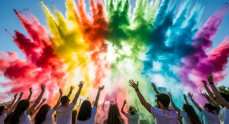 People in a group throwing colored powder in the air, creating a vibrant and dynamic scene of celebration and joy.