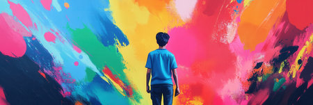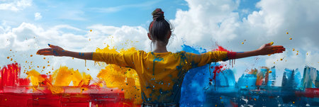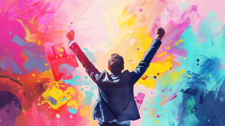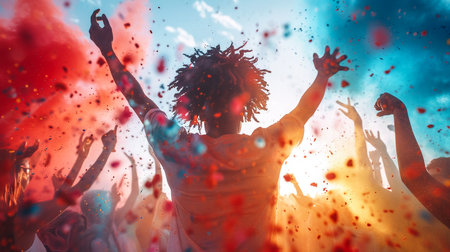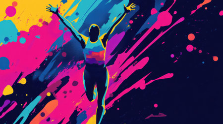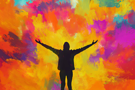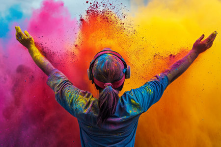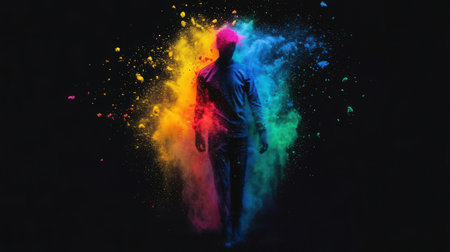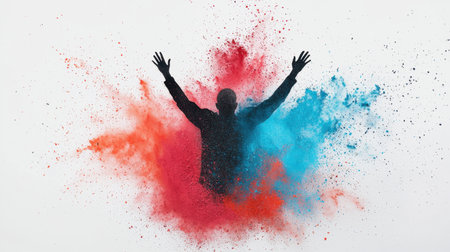 A striking silhouette of a person with outstretched arms is set against a vivid explosion of colored powder, creating a captivating visual that evokes joy and freedom.