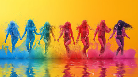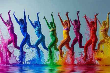 A lively group of women in swimsuits joyfully jumping into the water, A splash of colors representing various group fitness classes, AI Generated