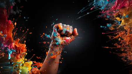 Rainbow colors painted hand raised making fist on a black background. LGBT pride symbol. Generative AI