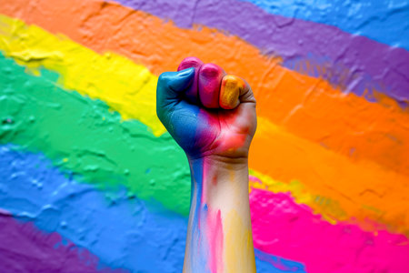 Raised fist against a vibrant rainbow background, symbol of strength and unity concept
