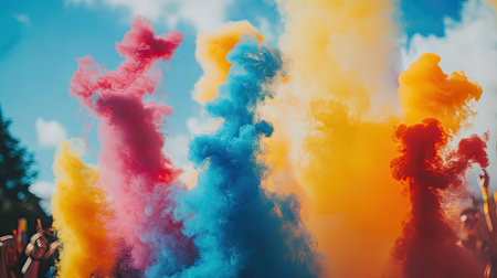 A dynamic and vibrant image of hands releasing colorful clouds of smoke, creating an artistic and energetic composition with bold colors and dramatic lighting.