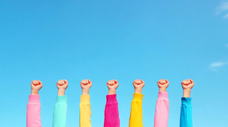 Diverse Unity: A vibrant display of solidarity with fists raised against a brilliant blue sky backdrop.