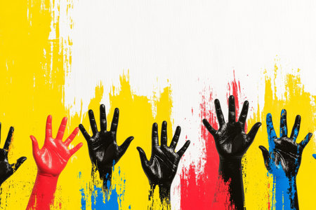 group of colored hands rising in the air, several colorful hand prints with the symbol for democracy, many colorful arms in different colors, by ai generative
