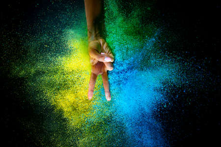 Female hand and explosion of colored, neoned powder on black studio background with copy space. Magazine cover, wallpaper design