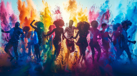 Holi festival celebration, people colorful silhouettes smear and drench each other with colours. Generative AI