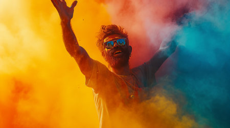 A man enjoys a festive moment, covered in bright colors, with splashes of orange and yellow surrounding him, expressing joy and creativity at a cultural celebration.