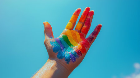 A hand painted with vibrant rainbow colors against a clear blue sky, symbolizing diversity, pride, and creativity.