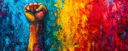 Five vibrant painted hands raised in fists symbolize unity, strength, and diversity, set against an abstract colorful background.