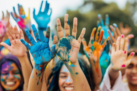 People with painted hands celebrate, sharing joy and color during the festive Holi event