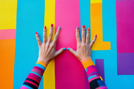 A person with their hands painted in bright colors, AI