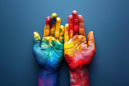 Two hands painted with bright colors are raised, signifying support and acceptance of LGBT human rights. Created with Generative AI