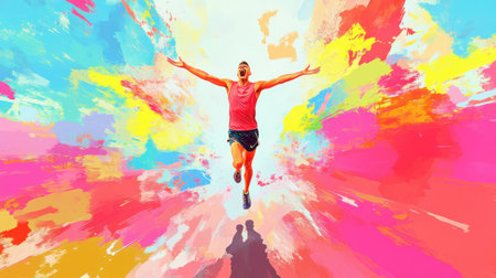 An energetic runner joyfully celebrates as they cross the finish line, arms raised in victory. The colorful backdrop enhances the dynamic feel of athletic success and freedom.