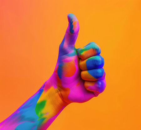 Multicolored thumbs up hand painted on orange background representing positive feedback and support