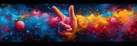 Four hands making victory signs with fingers painted in multiple colors against a vibrant painted backdrop