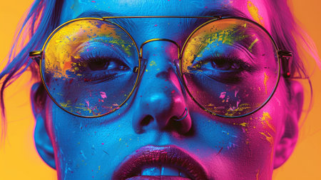 Closeup of a mans face covered in vibrant paint splashes, wearing cool sunglasses