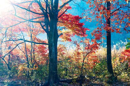 Sunset in the autumn forest. Beautiful nature background. Colorful foliage.