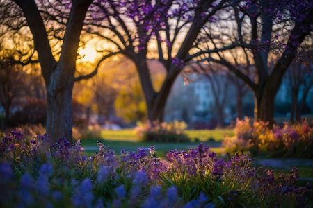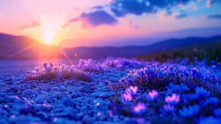 Vibrant wildflowers bloom in a colorful field at sunset enhancing natural beauty