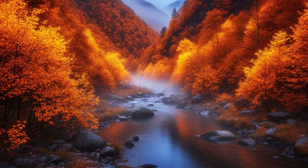 An AI generated illustration of a river flowing through a colorful landscape in autumn