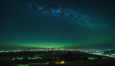 Starry night reveals vibrant city lights against a contrasting dark sky