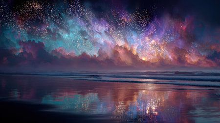 A captivating depiction of a cosmic sky filled with vibrant stars and colors, reflecting on tranquil ocean waves at dusk, creating a dreamy and serene atmosphere.