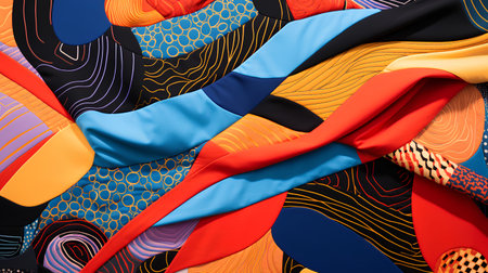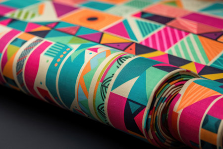 close-up of vibrant textile print, with geometric shapes and bright colors, created with generative ai