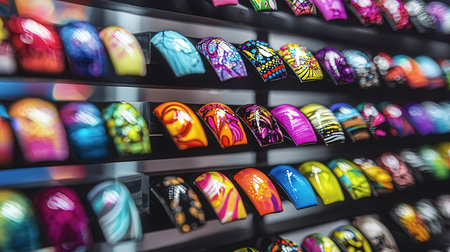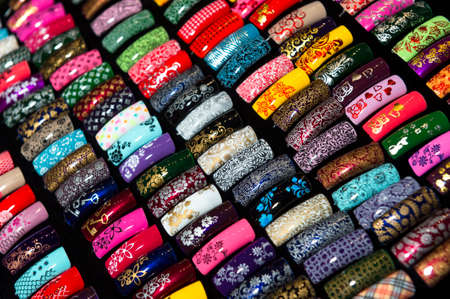 Nail samples, big collection of fingernails painted in various color with different pattern, selective focus