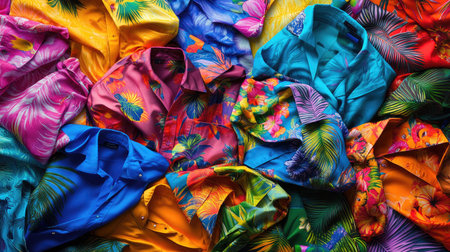 A stunning arrangement of vibrant tropical shirts featuring bold, colorful patterns perfect for summer outings, beach days, or festive gatherings.