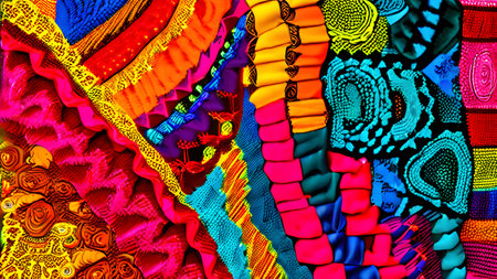 Vibrant multicolored fabric with ornate floral patterns and detailed textures. That the image is generated using AI.