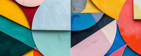 Modern art mural wallpaper background showcasing overlapping geometric forms in vibrant colors, creating a playful and dynamic visual effect.