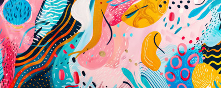 Abstract aesthetic vibrant colorful hand drawn background in naive art style with shapes, brush strokes, dots, lines. Textured boho wallpaper, art print, poster, creative banner