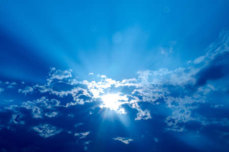 Blue sky with white clouds and sunbeams. Natural background.