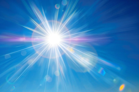 Bright sun shining in a clear blue sky. Radiant sunlight with lens flare effect.