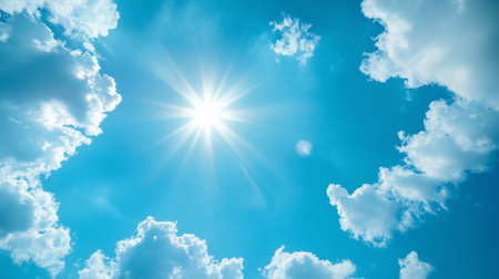 Vibrant Blue Sky with Fluffy White Clouds Under the Bright Sun, Capturing Summer s Natural Beauty
