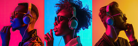Neon Portraits, Emotional People Faces Collage, Young People Listen to Music with Headphones, Generative AI Illustration