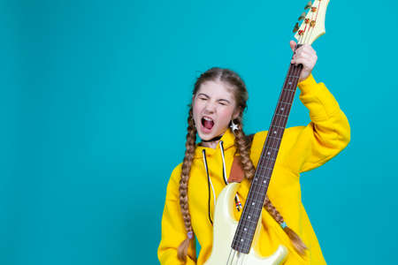 Winsome Caucasian Female Guitar Player With Yellow Bass Guitar Posing In Fashionable Yellow Hoody Jacket While Singing Over Trendy Turquoise Background. Horizontal Shot