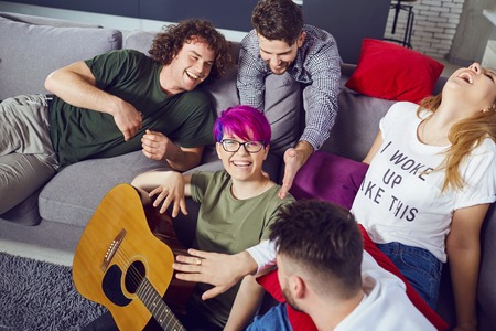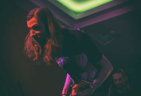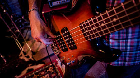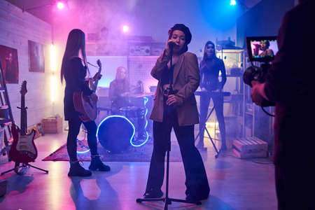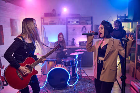 Repetition of retro music band at music studio. Young musician playing acoustic guitar and singing. Rehearsal base. Concept of art, music, style and creation