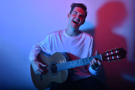 A man plays an acoustic guitar in neon red-blue light. A man learns to play the guitar, music, hobbies.