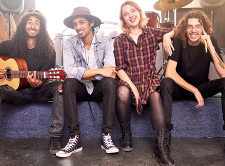 Were here to entertain you. Full length portrait of a band sitting on stage before their gig.