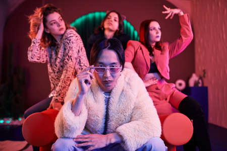 Portrait of Asian dance crew leader looking at camera over colored glasses with girls in background, lit by red neon
