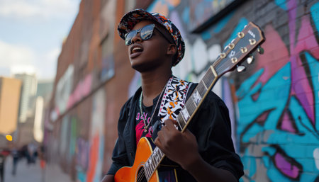 A vibrant urban scene with graffiti walls and a young street performer singing passionately
