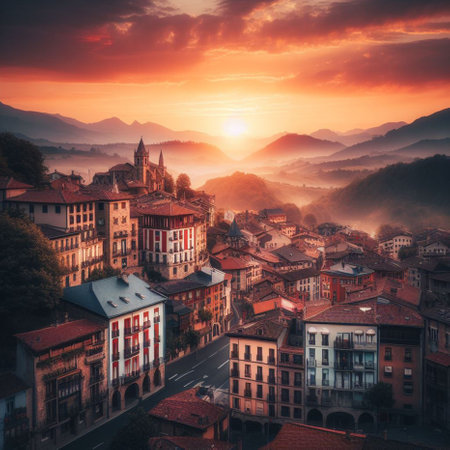 A charming small town nestled in a valley, illuminated by warm streetlights and set against a backdrop of rolling hills and mountains under a cloudy evening sky.