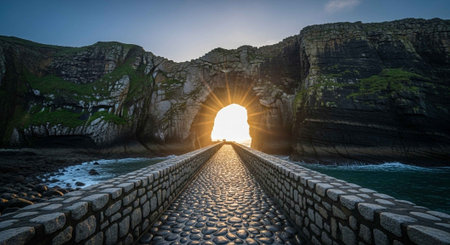 Dramatic coastal scene depicts towering rock formations beside a wavy ocean under a colorful sunset. The image displays warm sunlight and cool shadows across the scene. The composition may be suitable for travel, nature, or environmental themes, and ideal for commercial purposes.