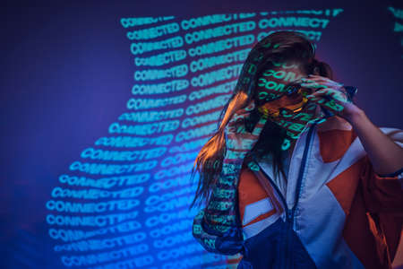 Cyberpunk portrait. Millennial nightlife. Advertising background. Content promotion. Fashionable gorgeous woman in neon LED light isolated on dark copy space.